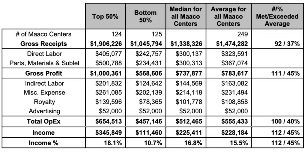 - Cost of Goods Sold (COGS): Includes parts, labor, and direct expenses.